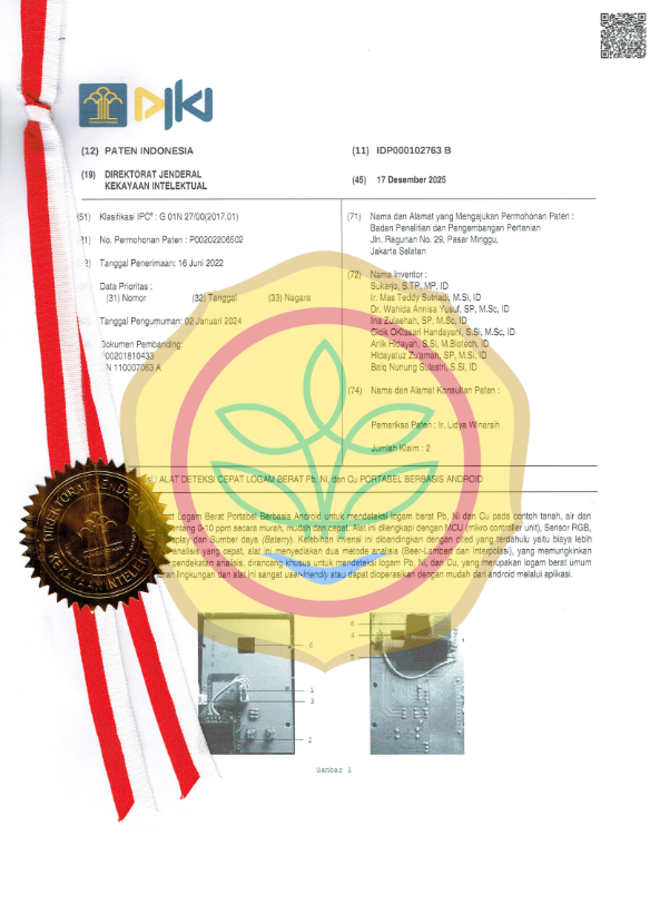 Alat Deteksi Cepat Logam Berat Portabel Berbasis Android untuk mendeteksi logam berat Pb, Ni dan Cu pada contoh tanah, air dan tanaman dengan rentang 0-10 ppm secara murah, mudah dan cepat. Alat ini dilengkapi dengan MCU (mikro controller unit), Sensor RGB, sensor CMOS, Display dan sumber daya (Baterry).